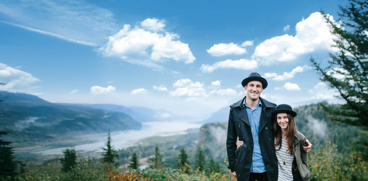 Mann und Frau mit Hut in den Bergen haben ihre Arme umeinander geschlungen und lächeln in die Jamera