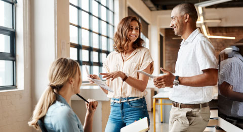Eine Gruppe von drei Personen unterhält sich im Büro über ein Projekt