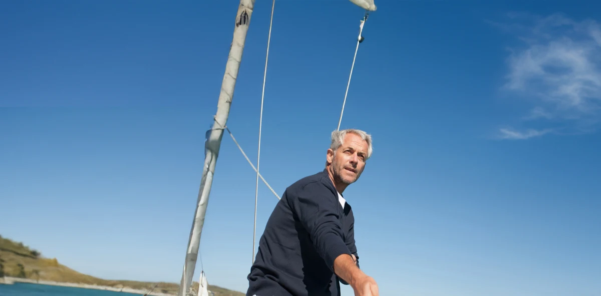 Mann mit grauen Haaren hisst auf einem Boot die Segel